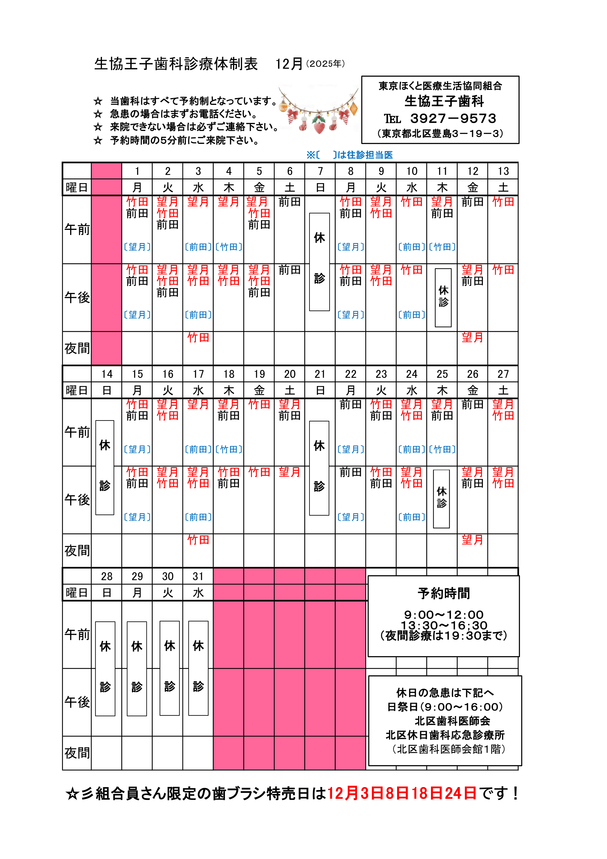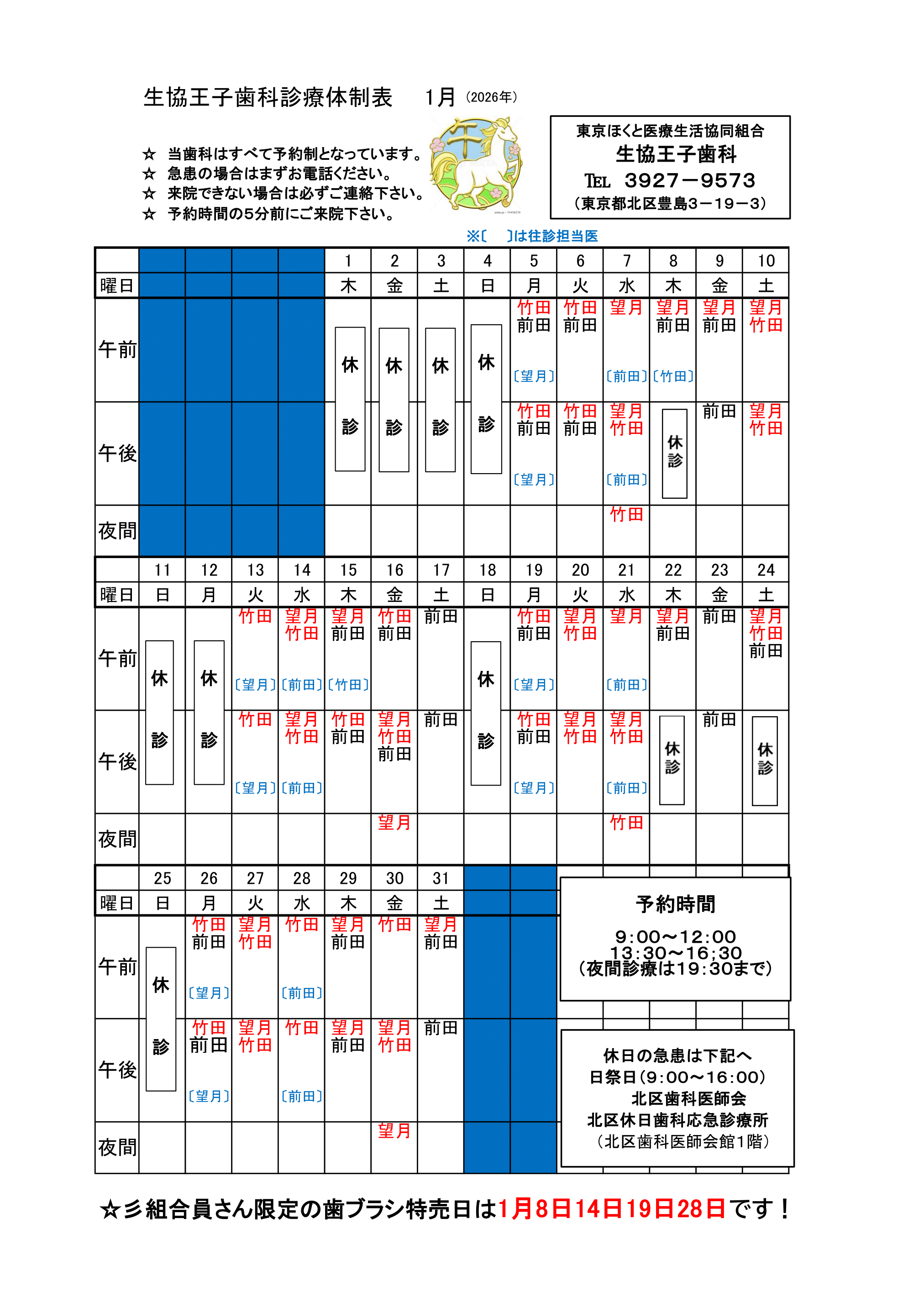 | 生協王子歯科・受付 03-3927-9573 予約受付時間 午前 9時〜12時 午後 13時半〜16時半 夜間 水曜又は金曜のみ 19時半迄 |