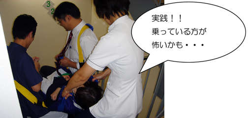 裏口へ続く階段はかなり急で狭く、車いすのままでは無理があり、緊急時にはおんぶすることも考えられますが、患者さんの体格もわからない・・・ということで、簡単に使える担架を購入しました。